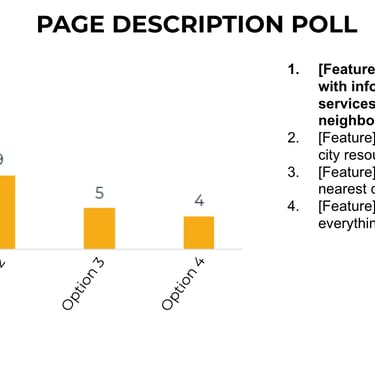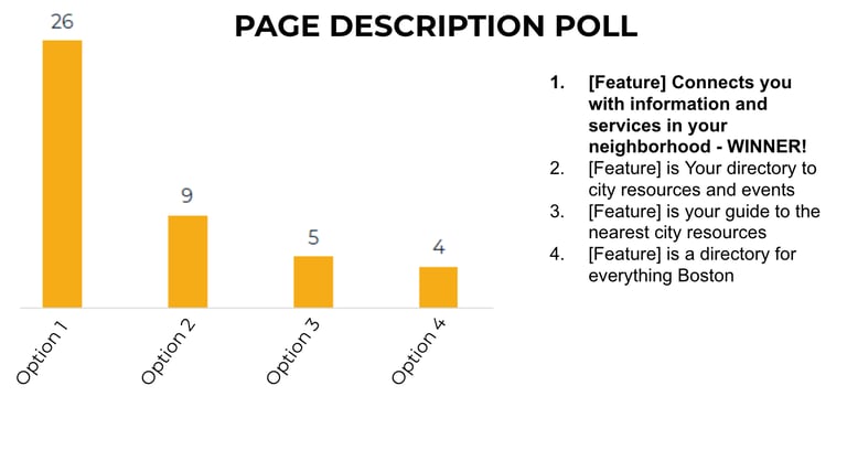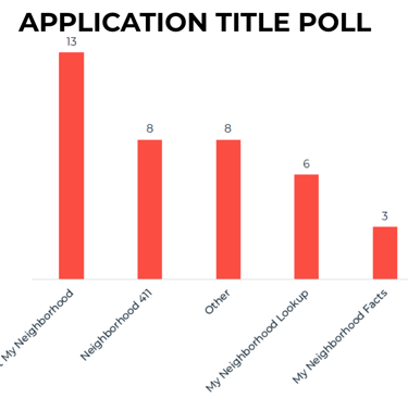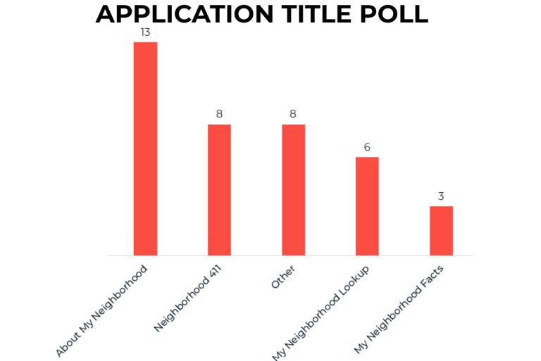 We were not sure what to name the feature. The City of Boston originally called their feature “My Neighborhood Look Up,” but they do not love that title so they asked us to come up with some new options. To do this we had a brainstorming session as a group and came up with all the names we could think of. We each had three points to votes for the titles that we liked most from the list. The top four answers from our voting system was then placed on a google form to ask the public. About My Neighborhood won by five votes.