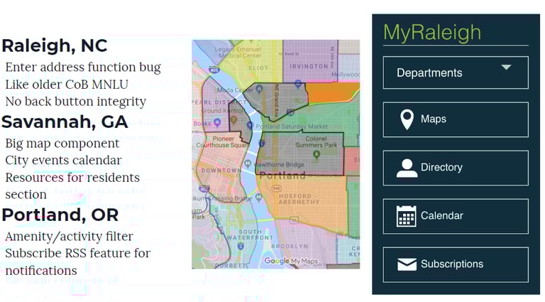As a group we analyzed other city websites to better understand how they designed a similar feature. We looked at Raleigh, NC – Savannah, GA – Portland, OR – and found: