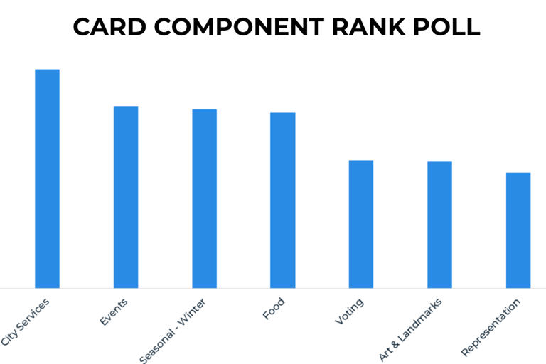 To simplify the adding process since this was done manually by me and me alone, I added each user’s category-preference-number in excel. So if someone like City Services MOST, they gave that category a ONE. (Keep in mind that if a user liked a category the LEAST it got a NINE). So, when added up the more popular categories would have a lower average score. Just like in golf, the lowest score wins. After calculating the average scores in Google Sheets (Google’s Excel), we found City Services and City Resources to be the most popular. So, those categories were the first options users would see.